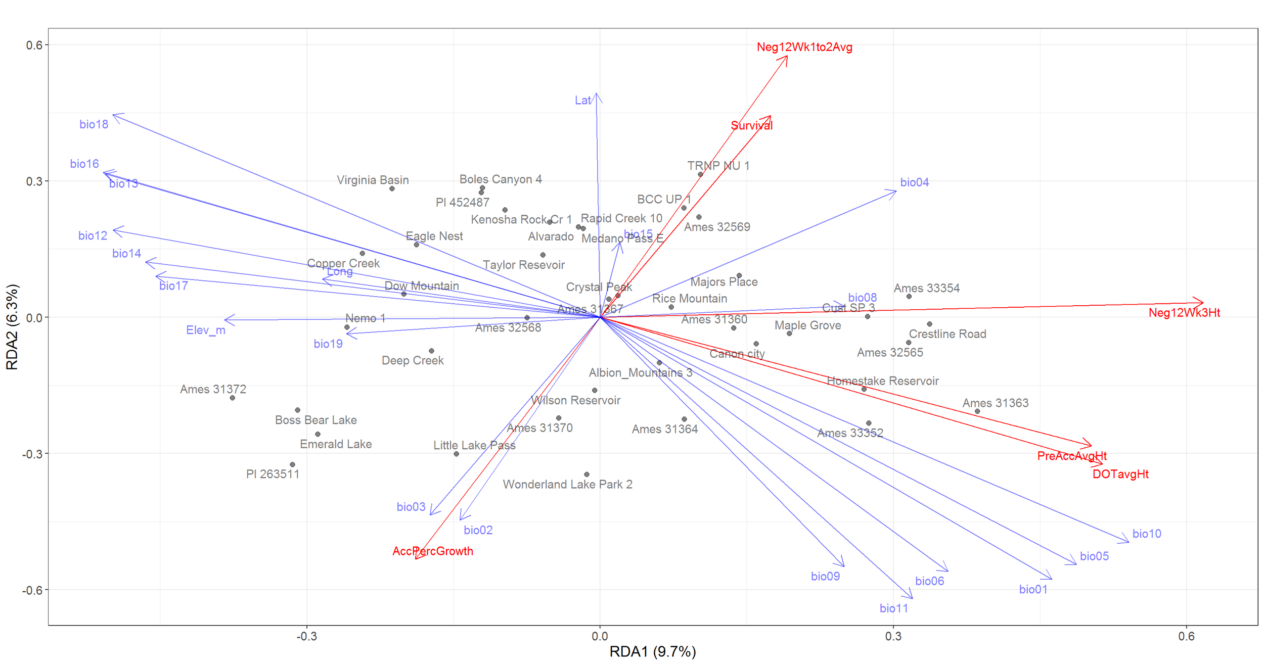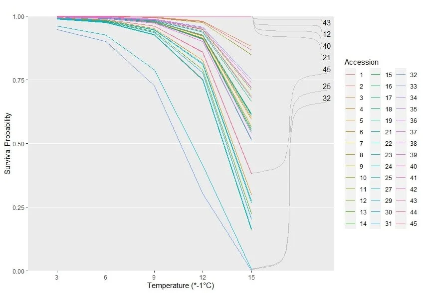 My personal work developed improved statistical modeling for use in studying perennial species. Measuring adaptations for freeze tolerance was the first demonstrated use of this adaptation for perennial crop study. (See graphs to the left)
